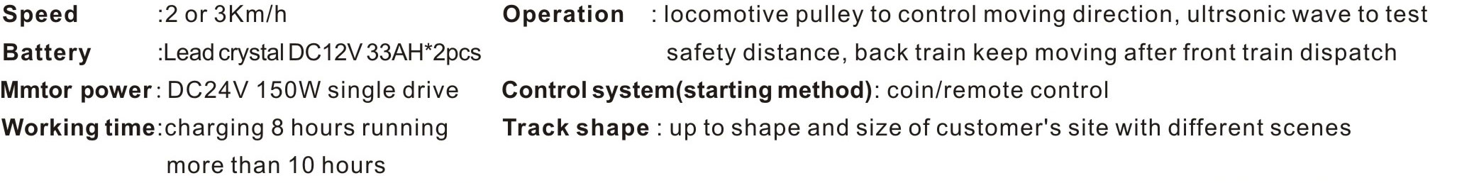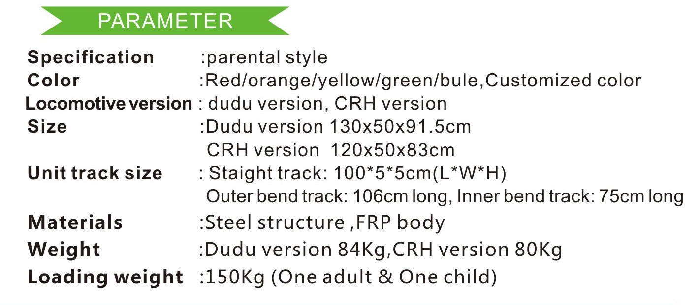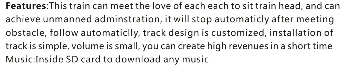 Every kid and have suppurate locomotive. It runs without management and stop at front of obstacle. The track has many shapes,which is up to customer requirements.
